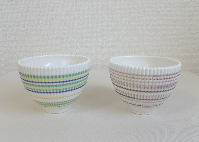 ・ 作家 白鳥好貴 ・ なんて可愛らしい雰囲気。 スモーキーな色合いのラインが幾重にも重なり、とても手が込んでいます。 どこかアンティークのような雰囲気は、やさしさも感じます。 グリーンには、さり気ない白のラインに、下部にゴールドがはいっていて、独特の色あわせ。 ピンクにはグレーのラインに、キラキラ光るラインがはいっていて、女性らしい雰囲気たっぷり。 裏底も、作家独自のゴールドにリースのようなかわいらしい柄。 いつものシンプルな器たちに、こんな素敵な器たちが並んだら、テーブルがぱっと華やかになること間違いない。 真っ白な器たちとあわせても、絶対素敵。 飯椀としても、果物やおやつをいれたり、もちろんヨーグルトとかデザートいれても。 スープもいいですね。 自分用にも、パートナーとの新居の器にも、もちろんプレゼントも喜んでもらえそうな予感。 一点ものの贅沢感を味わえます。 ・直径(上部)約12センチ・(底部)約4.5センチ 高さ約7センチ ・産地 茨城県笠間市 ・材質 磁器 ・電子レンジ不可 手作り品の為、色あい・サイズ等に個体差があります。 予めご了承の程、よろしくお願い致します。 ※光が反射している部分や、光の加減で色合いに画像と見え具合が多少違う可能性があることをご了承くださいませ。 ● 作品への想い ● 誰かにプレゼントをするような、器を手にとった時にやさしく楽しい気分になるような器をつくっていきたいと考えている作家さんです。 型を用いた近代的な技法に、ポップなカラーが印象的です。 手にとった時になじむような、使いやすさも考え作陶しています。