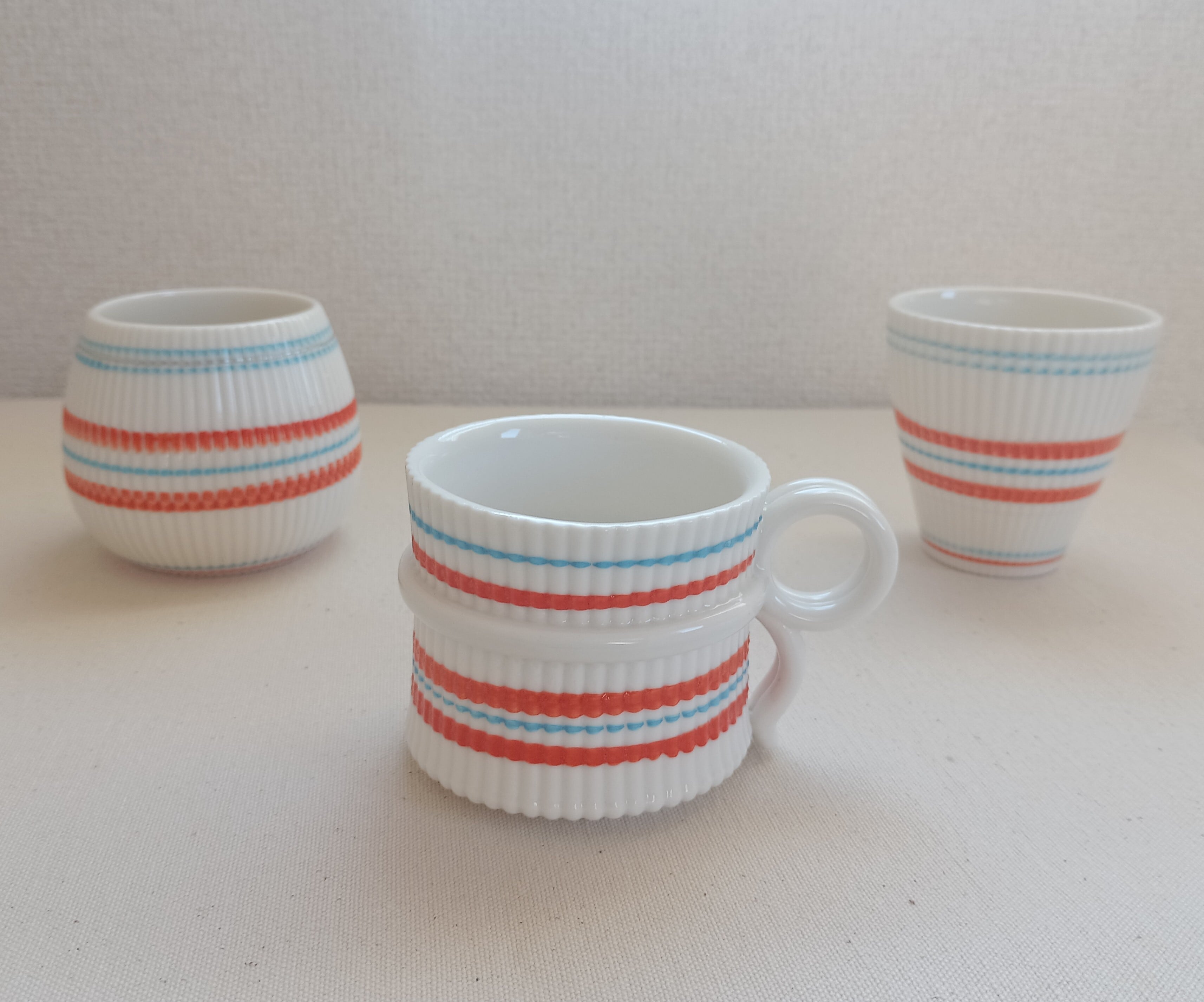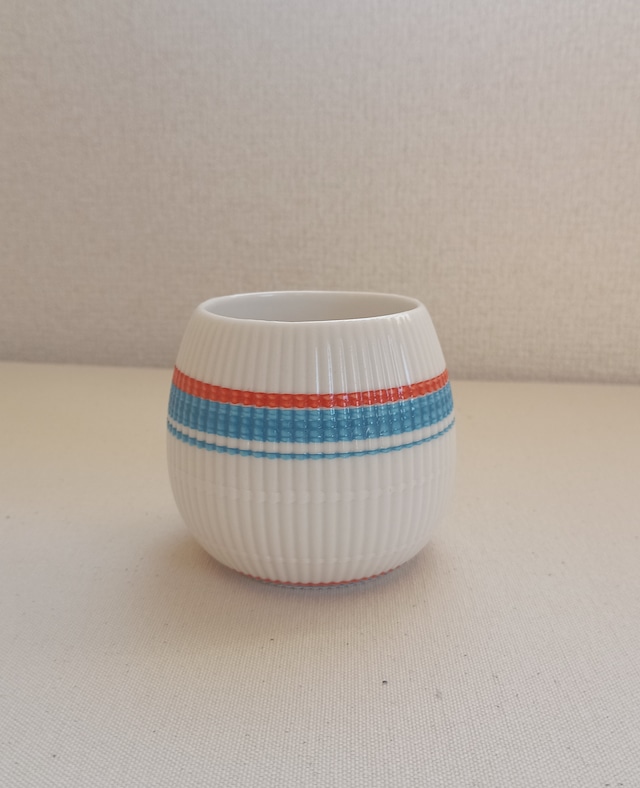 ・ 作家 白鳥好貴 ・ ポップなカラーに、ちょこんとした小ぶりの形が可愛いカップです。 型を使う技法の独特な形状に、カラフルなラインの組み合わせ。 独走的でモダンな作品です。 カップの裏底には、リースのような愛らしい柄が描かれています。 カップに描かれたラインの濃淡、箇所箇所によって違うにじみが手描きならではの味を感じられます。 ちょうど指で持つ部分に、段があるので持ちやすさも格別。 作家の優しさを感じます。 細部までこだわり抜かれた作品です。 ・直径(上部)約7.5センチ・(下部)約4センチ ×高さ約7.5センチ ・産地 茨城県笠間市 ・材質 磁器 ・電子レンジ不可 手作り品の為、色の出方・サイズ等に個体差があります。 予めご了承の程、よろしくお願い致します。 ※光が反射している部分や、光の加減で色合いに画像と見え具合が多少違う可能性があることをご了承くださいませ。 ● 作品への想い ● 誰かにプレゼントをするような、器を手にとった時にやさしく楽しい気分になるような器をつくっていきたいと考えている作家さんです。 型を用いた近代的な技法に、ポップなカラーが印象的です。 手にとった時になじむような、使いやすさも考え作陶しています。