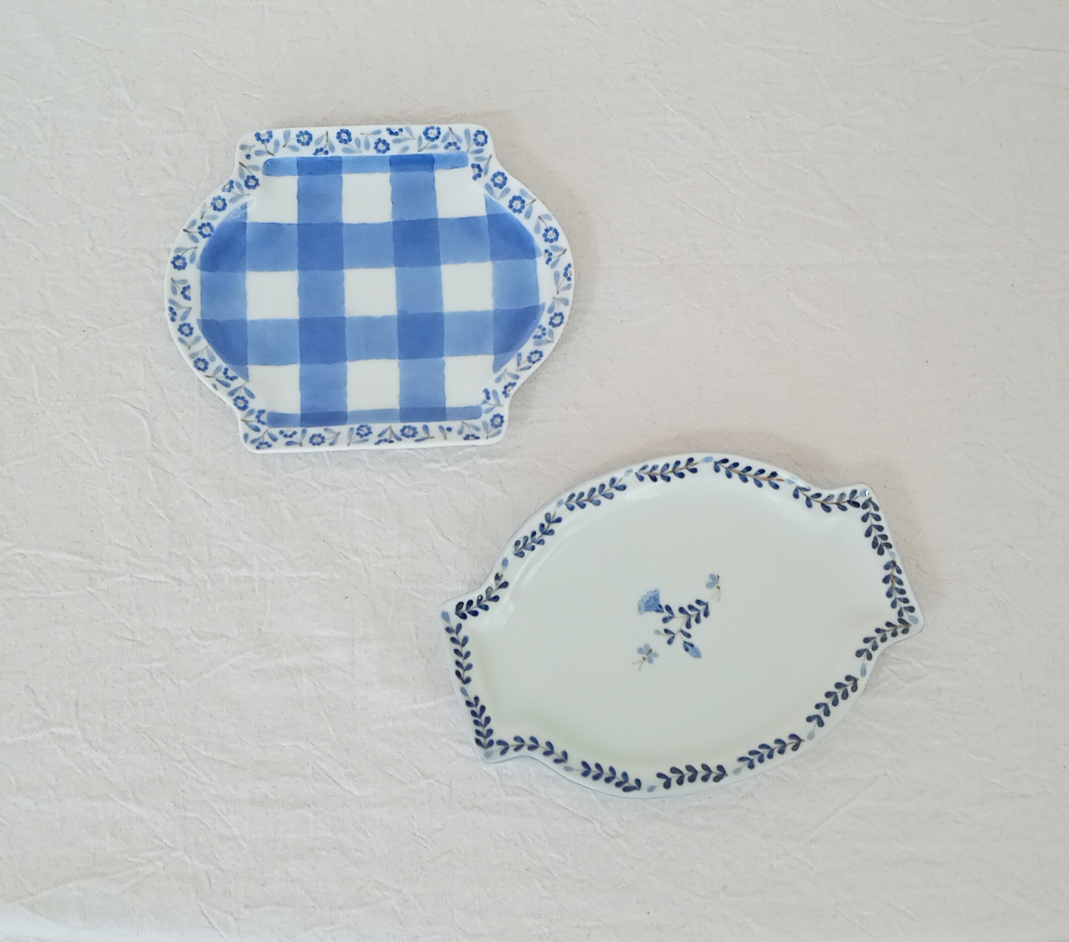 ● Kayo porcelain & pottery ● ブルーのチェックと、小花の組み合わせなんて最高すぎる。 青って、可愛くなりすぎず、 主張するけど、何色ともあう。 細かく丁寧に描かれた小花は、手仕事ならでは。 らんたんのようなころんとした独特の形が、 またかわいい。 和菓子や洋菓子、いつものおやつもちょこんとのせたらあらかわいい。 ドーナツのせたら、幸せ時間の始まり。 ひとさらひとさら。 細部までこだわり、丁寧に描かれた絵付けは、形や柄がおなじものはなく、 手仕事ならではのやさしさ、あたたかさを感じます。 店主がひとめぼれして、入荷させていただいた作家さんの作品です。 今日はこれになにのせよう。 楽しみになるおやつの時間。 ほっこり幸せな時間が浮かんできそうな、 作品です。 磁器なので、レンジで使えるのも嬉しい。 ちょっとひと息したい時、 おやつ時間のお供にと、 毎日の愛用品なりそう。 ● 作家について ● 香代 Kayo porcelain & pottery 1992年 熊本生まれ 福岡育ち 2015年 武蔵野美術大学造形学部工芸工業デザイン学科陶磁専攻卒業 2017年 佐賀県有田窯行大学工専門課程2年コース卒業 (卒業制作にて柿右衛門賞を受賞) 有田焼のメーカーに入社 デザイナーとして従事 2022年 作家名香代として作陶活動を始める。 【 素材 】 磁器 【 大きさ 】 縦 約13センチ 横 約15.5センチ 高さ 約2センチ 【 取り扱い 】 電子レンジ・食洗器可 ・やわらかいスポンジ等で、やさしく手洗いをお願いいたします。 ※画像の角度や光の具合で、実際の色味と多少違って見える場合もございます。 ※手作業のため、同じ材料、絵の具、釉薬を使っていても、制作や焼成のタイミングの違いでひとつひとつ違いが生まれます。 手仕事ならではの味わいとしておたのしみください。