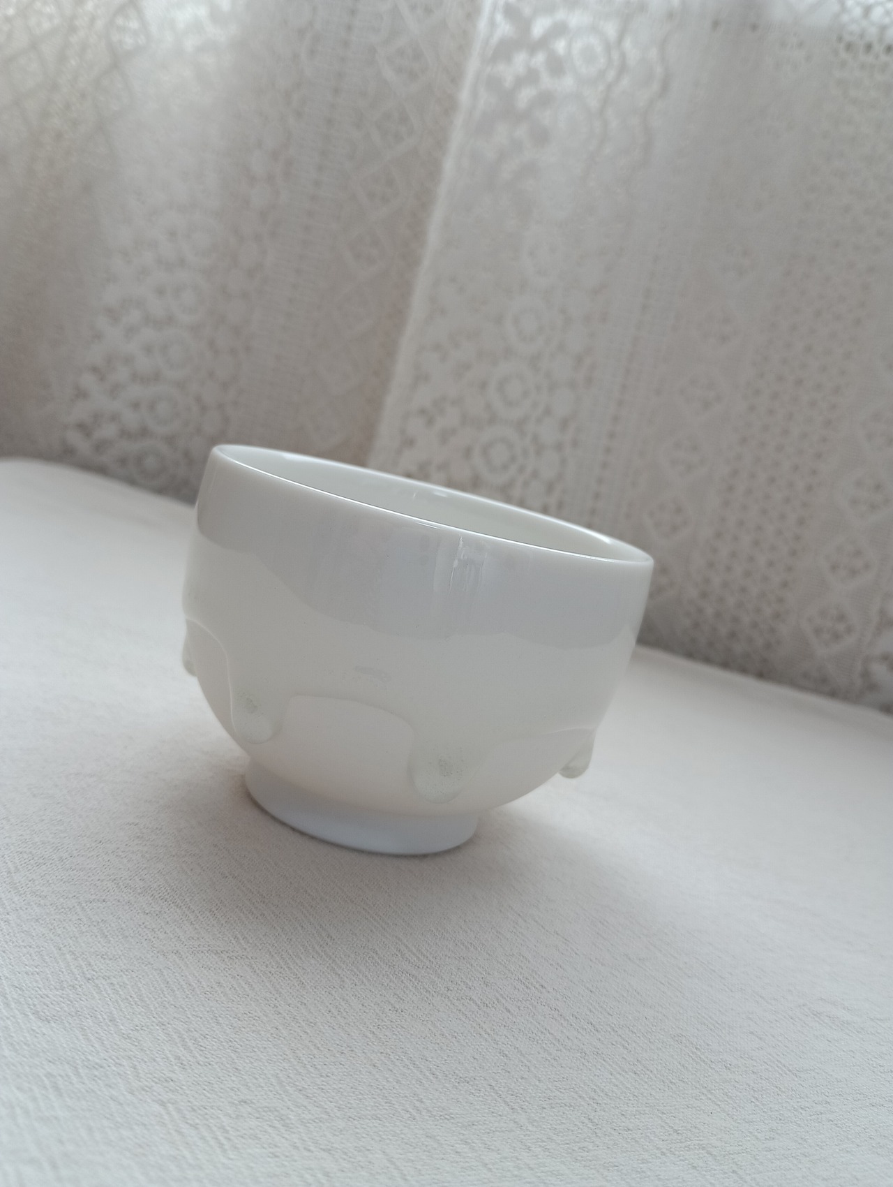 真っ白な器肌に美しい透明感の釉薬が滴る瞬間をとらえた器は、垂れるひとつひとつのしずくがいろんな景色をみせてくれます。